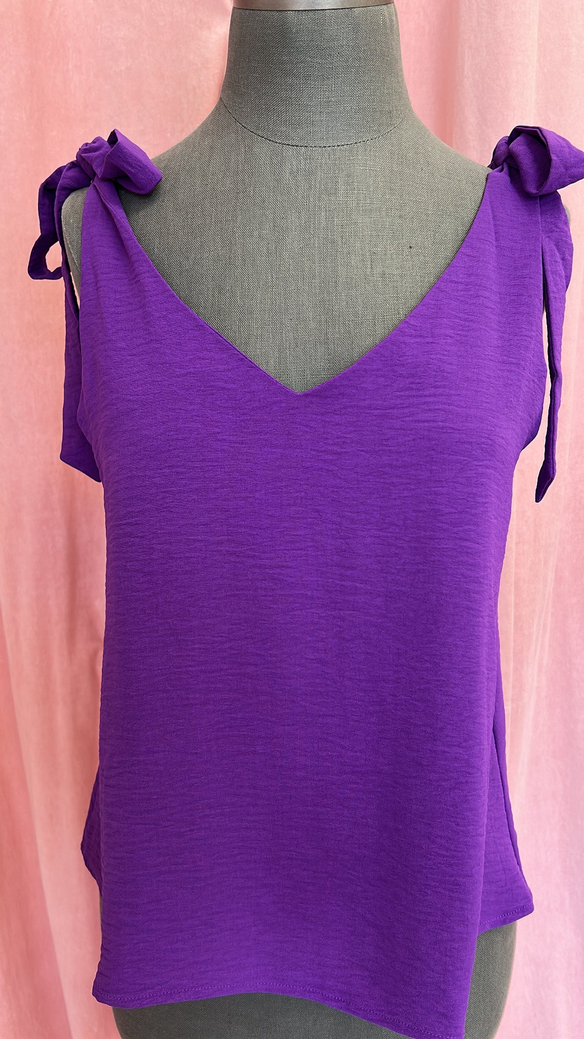 Add a pop of fun to your wardrobe with the Noelle Flowy Tie Strap Top. This purple v-neck beauty features playful self-tie straps and a breezy, flowy fit that moves with you. Perfect for sunny days or casual nights out, it’s a charming way to stay cool and stylish all day long.